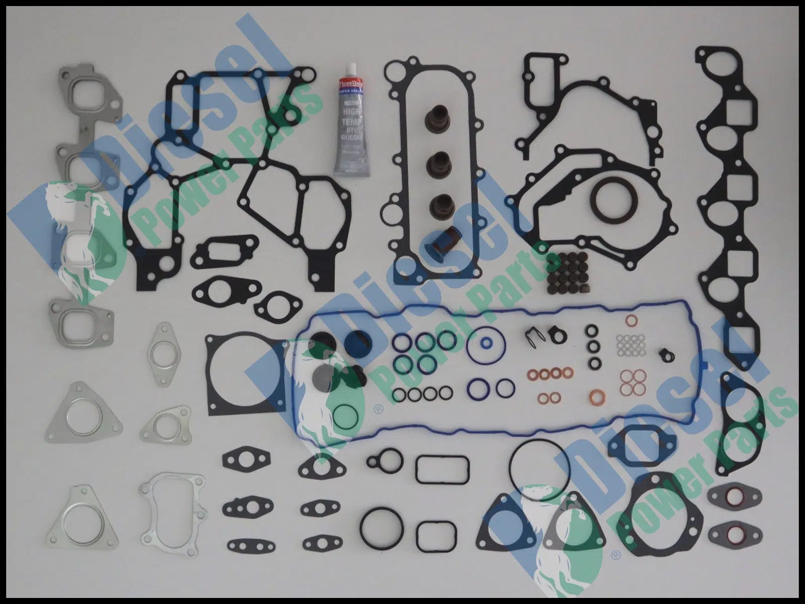 This set includes: Rocker Cover Gasket, Glow Plug Seals, Inlet & Exhaust Manifold Gaskets, Valve Stem seals, Injector washers and o'rings, Fuel and Oil line washers and o'rings, Injector line seals, Water outlet gasket, Water Pump gasket, EGR Gaskets, Inlet manifold intake gasket, Turbo Mount gaskets, Front Oil Seal, Timing gaskets and Oil Cooler gaskets.